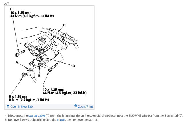 Unfasten the two bolts that mount the starter to the transaxle assembly, then remove the starter from the vehicle.