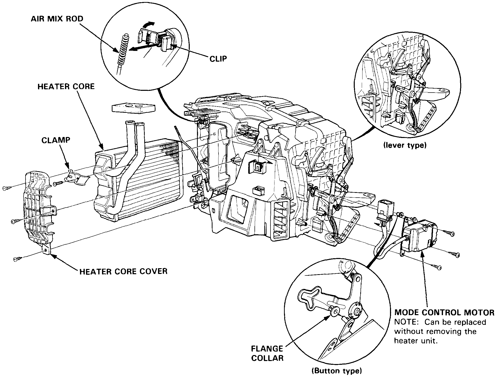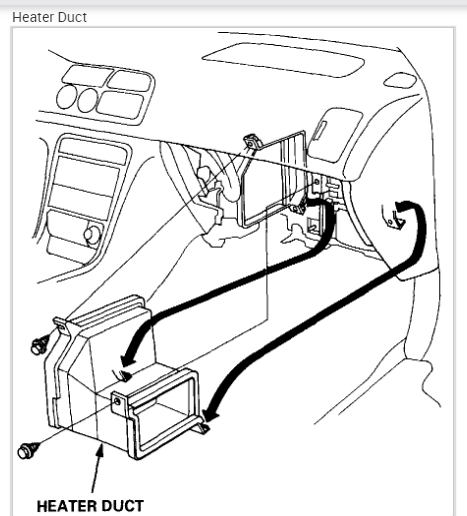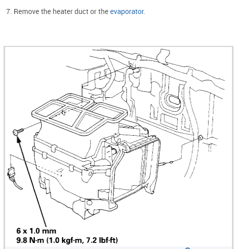 7. Remove the screw in the outside air door diaphragm (leave the diaphragm attached to the air door arm) and the blower mount bolts, then remove the blower.