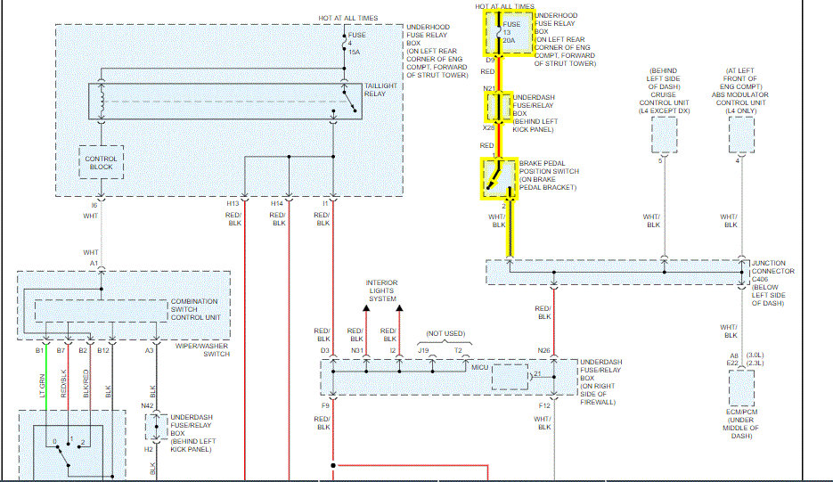 I attached a wiring diagram for you to view. You need to test for power to the brake light switch. In most cases, it is the switch that is bad.