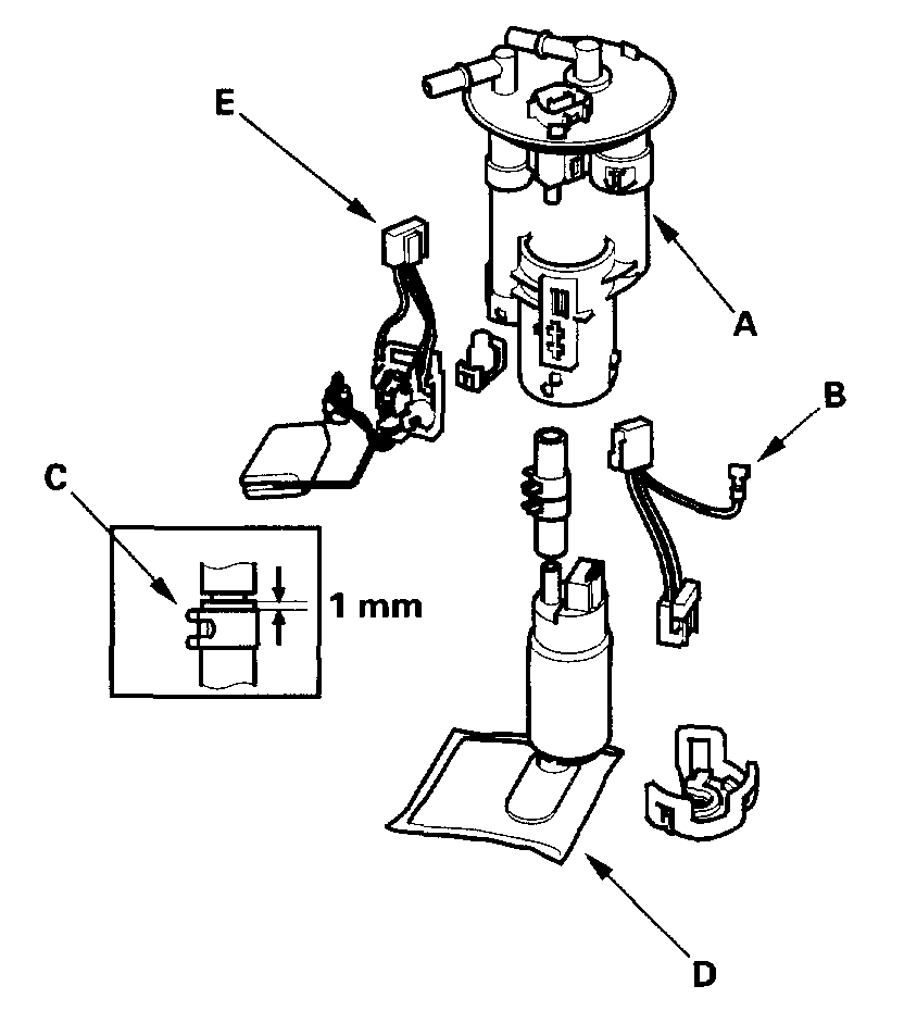 - When installing the fuel gauge sending unit (E), make sure the connection is secure and the connector is firmly locked into place. Be careful not to bend or twist it excessively.