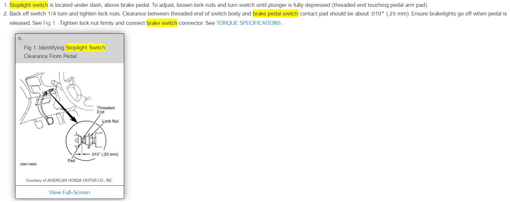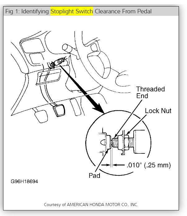 You will need a 14 mm open end wrench and a small pocket flat blade screw driver. Find the switch above the brake pedal and find the electrical plug. Use the screwdriver to take it off. Then loosen the nut on the switch with your wrench. Next install the new switch and turn it in until its almost all the way down. Attach the plug. Check the lights and make sure the brake lights work. Next if your car has cruise control drive your car and make sure it still works. If may need to adjust the switch in or out a turn. Once all things are OK. Tighten the lock nut on the switch.