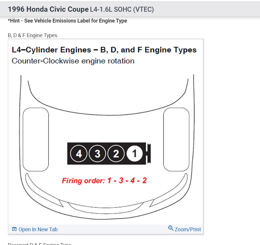 96 honda civic 1.6 L MFI SOCH 4 cyl. Firing order: 1-3-4-2 distributor rotation : clockwise. Here are the plug wire locations and the firing order. #1 on the cap is below as well, there are two different distributor caps so take note of the cap difference to identify yours. Check out the images (Below). Please let us know if you need anything else to get the problem fixed.
