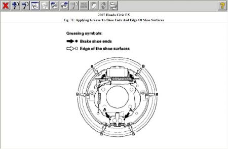 5. Apply a thin coat of Molykote 44MA grease to the shoe ends (A) and to the edge of the shoe surfaces (B) that make contact the backing plate as shown. Wipe off any excess. Keep grease off the brake linings.