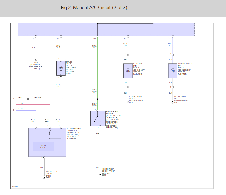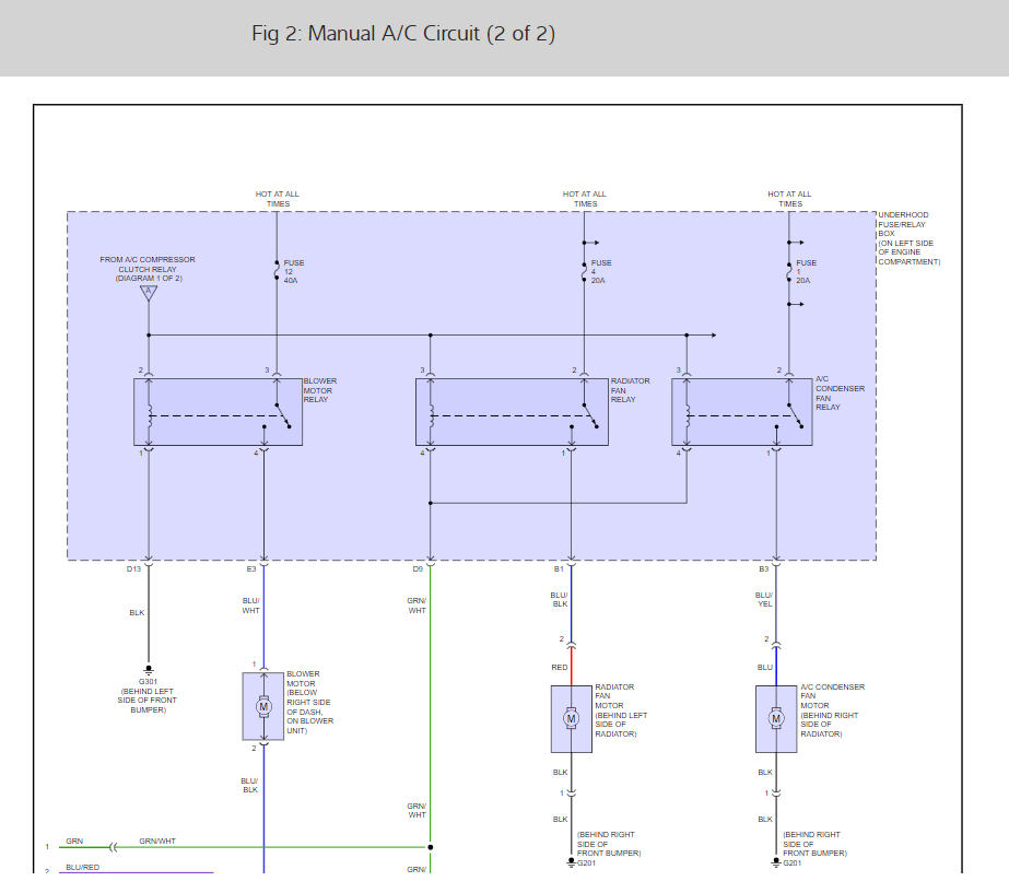 YES - Repair open in the BLU/WHT wire between the blower motor relay and the blower motor.