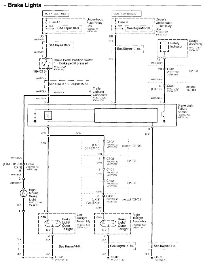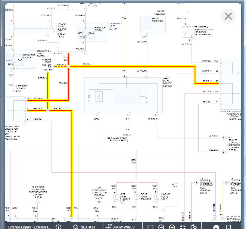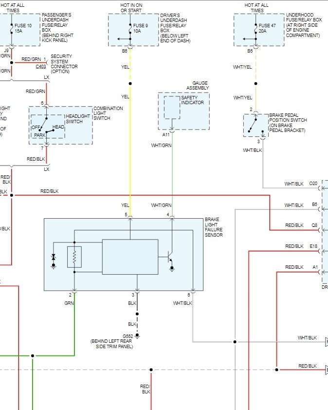 The lights are powered through two separate circuits. The CHMSL light is a direct feed from the brake light switch which shows the switch, fuse and it's wiring is good. However the body mounted lights use a feed from the switch that goes to the brake light failure sensor. That is fed from a different fuse (fuse 9) and controls the lights based on the power and the brake switch position. To test the system you need to access the brake light sensor. It is located behind the drivers side rear trim panel just inside the rear hatch. The first test is to unplug the connector on the module, then turn on the key, the light in the dash should stay off. Next with the connector unplugged you can take a test light and check for power at the Yellow wire on pin 5 with the key on then with the brake pressed test for power at the White w/black stripe wire on pin 6 If you have power on both of those the next test is to check the ground wire on pin 3, To check it you can use the test light and connect it between pins 5 and 3. With the key on it should light, if it doesn't the Black ground wire to the chassis is corroded or broken. The last test is to use a jumper wire between the Yellow wire on pin 5 and the Green wire on pin 2, with the key on the lower brake lights should come on if the wiring to them is OK. If those tests all show the various things as they are supposed to be the light warning module is bad and needs to be replaced. Or if you don't really care to know if there is a brake light problem you could replace it with a simple relay connect up as a replacement. For that you could wire a relay as shown in the last image. That would take the switch signal and turn on the relay which would then close the circuit for the brake lights. However you would lose the light warning on the dash.