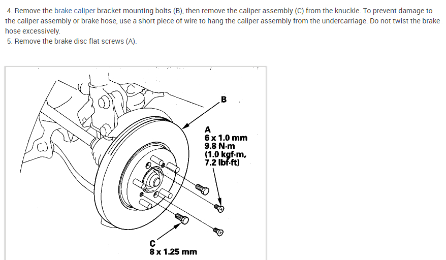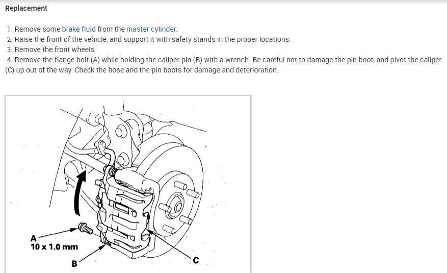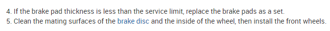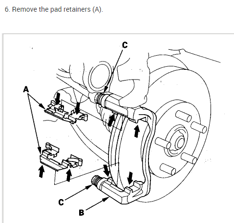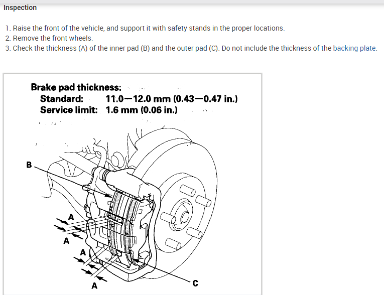I plan to do all of the minor maintenance service intervals recommended by honda myself. The minor service intervals are 7500 miles and 30000 miles for major factory maintenance checks; I will have a dealer do the major service. The minor maintenance requires an inspection of the bake pads. Please explain with illustrations if possible or direct me to an appropriate illustrated diagrams on how to do this. I will purchase tools required. Thank you