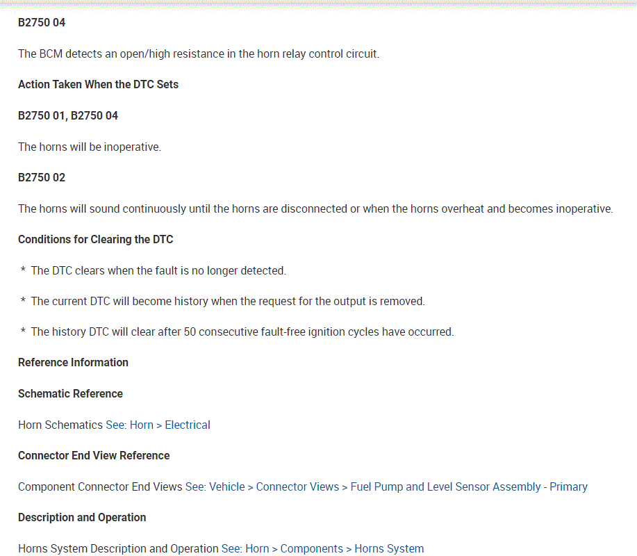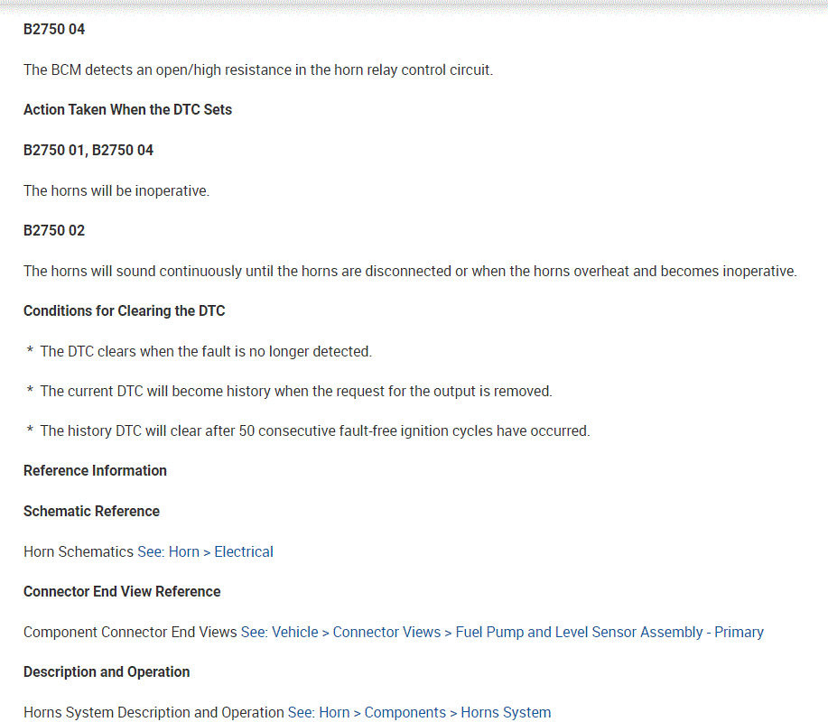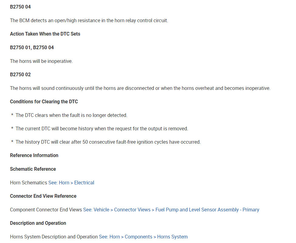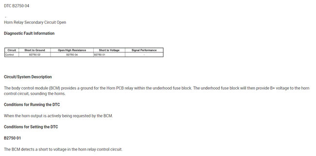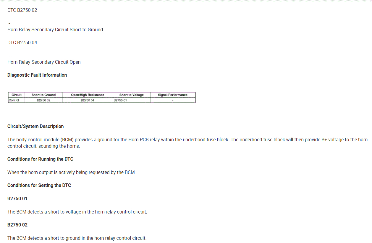 As far as the relay, here is how it works. The body control module, BCM, controls the horn operation. When the horn switch is pressed, it closes a switch pulling the horn signal circuit low. When the BCM detects the drop in voltage in the horn switch signal circuit, it energizes the printed circuit board, PCB, horn relay which provides B+ voltage to the horn control circuit, sounding the horn.