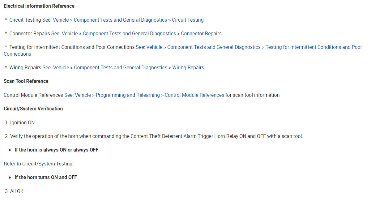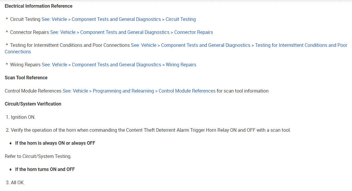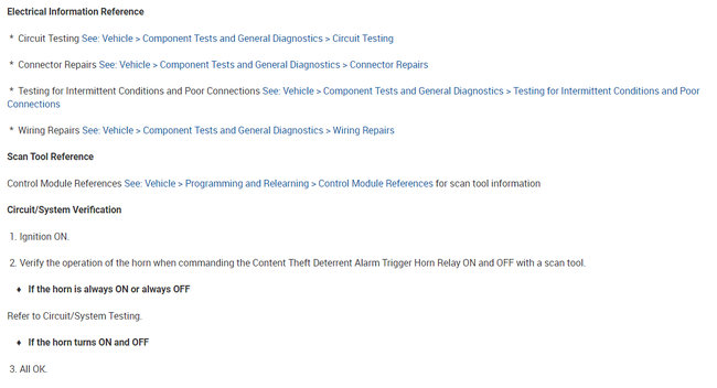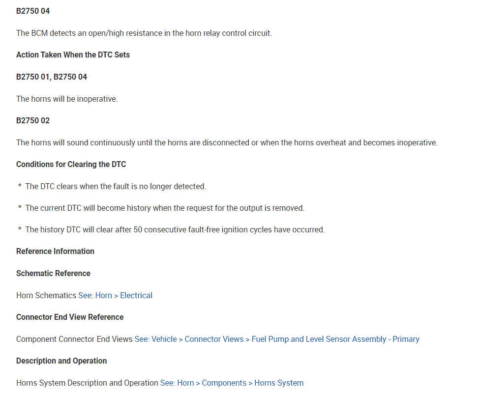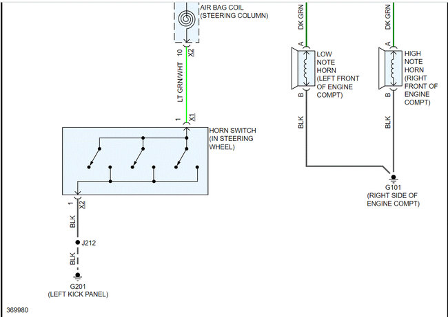 As far as the relay, here is how it works. The body control module, BCM, controls the horn operation. When the horn switch is pressed, it closes a switch pulling the horn signal circuit low. When the BCM detects the drop in voltage in the horn switch signal circuit, it energizes the printed circuit board, PCB, horn relay which provides B+ voltage to the horn control circuit, sounding the horn.
