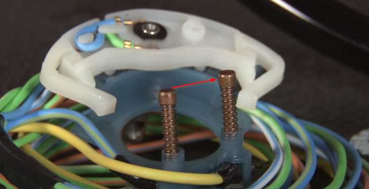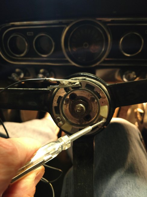 On the steering wheel with the horn ring removed, when testing for power the flat post on top that should be the ground, is not, the metal ring is the ground. When I connect between the contact and the ring I have power, between the contact and the flat post, nothing. What would cause this?