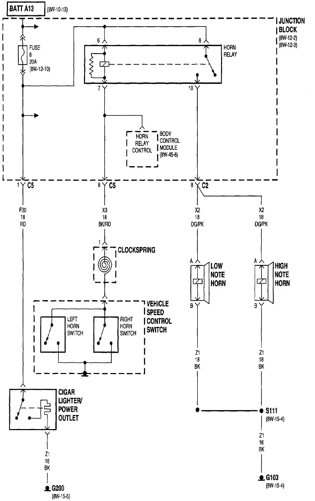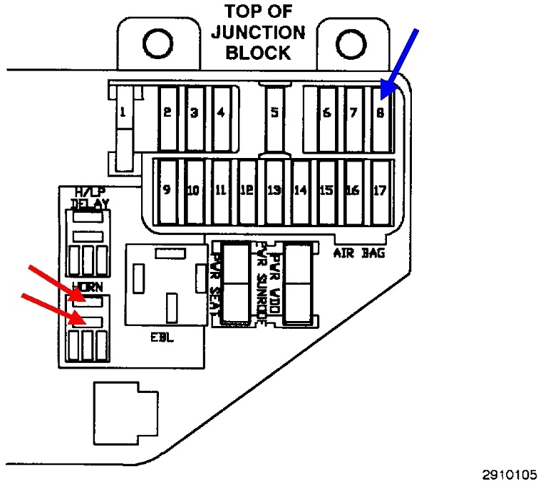 A quick test of the horns is to remove the horn relay from its socket, then use a stretched-out paper clip to connect the two terminals shown with the red arrows together. If the horns work and sound normal, we'll have to pursue the clock spring.