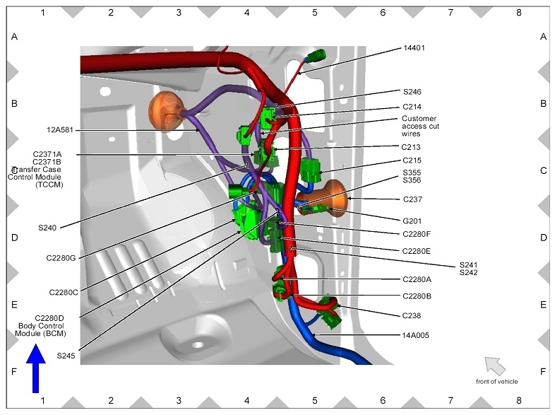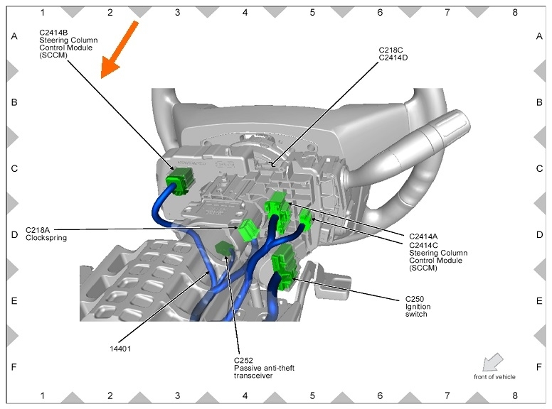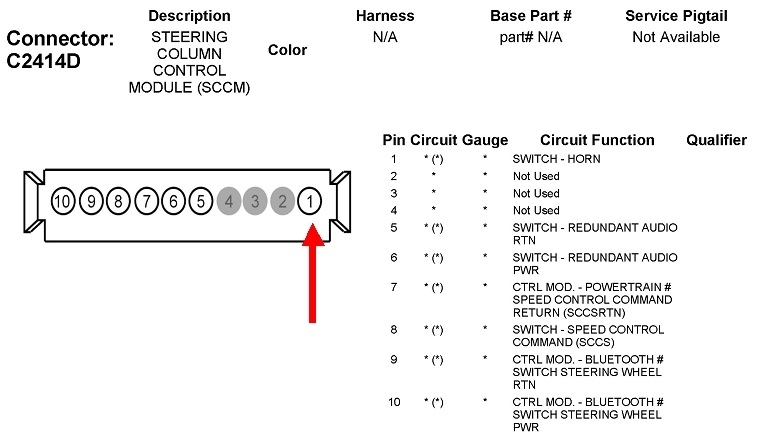 You can eliminate the horn switch wiring as a suspect by locating the Steering Column Control Module, (SCCM) and grounding terminal 1 in the 10-pin plug. That's shown with the red arrow pointing to it in the third drawing. If the horn turns on, there's break in that wire or the switch is defective.