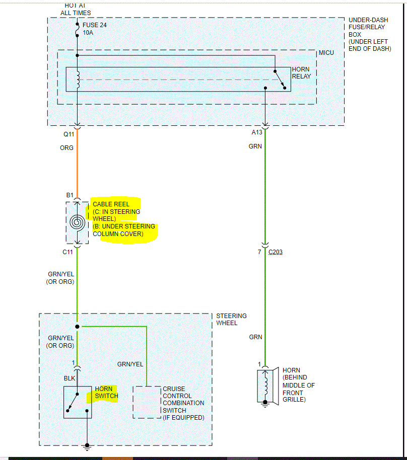 We know the horn is good, the relay is working, and the fuse is good. That leaves three things, the horn switch, cable reel (clock spring), or a wiring problem. If I had to guess, I would say the clock spring. Does the cruise control work? If not, that adds to that being the problem.