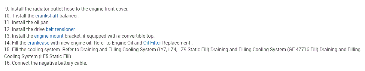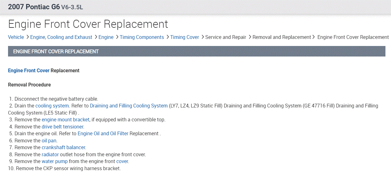 This will require the removal of several things, including the draining of the engine coolant, water pump, harmonic balancer, and many other components.