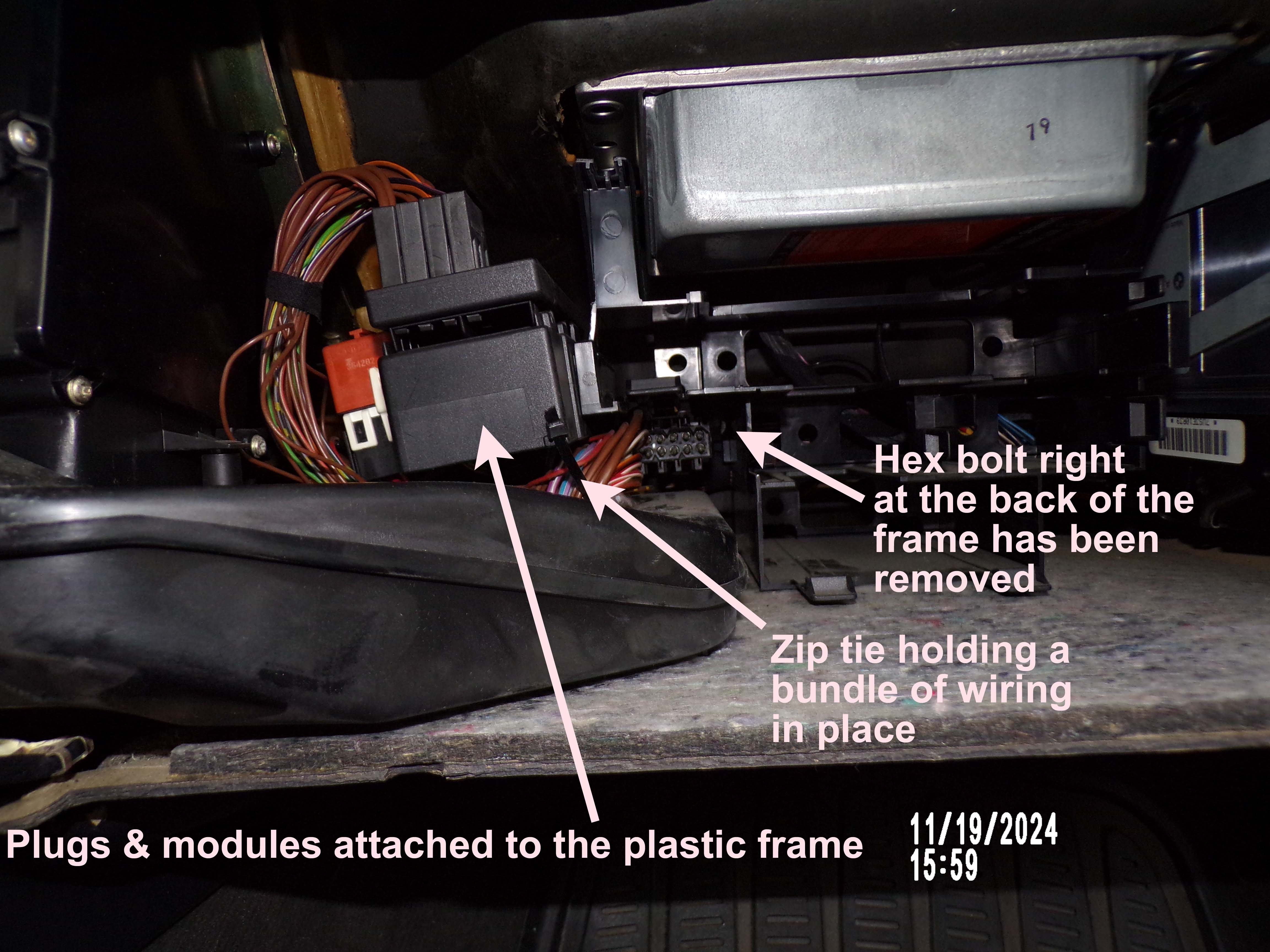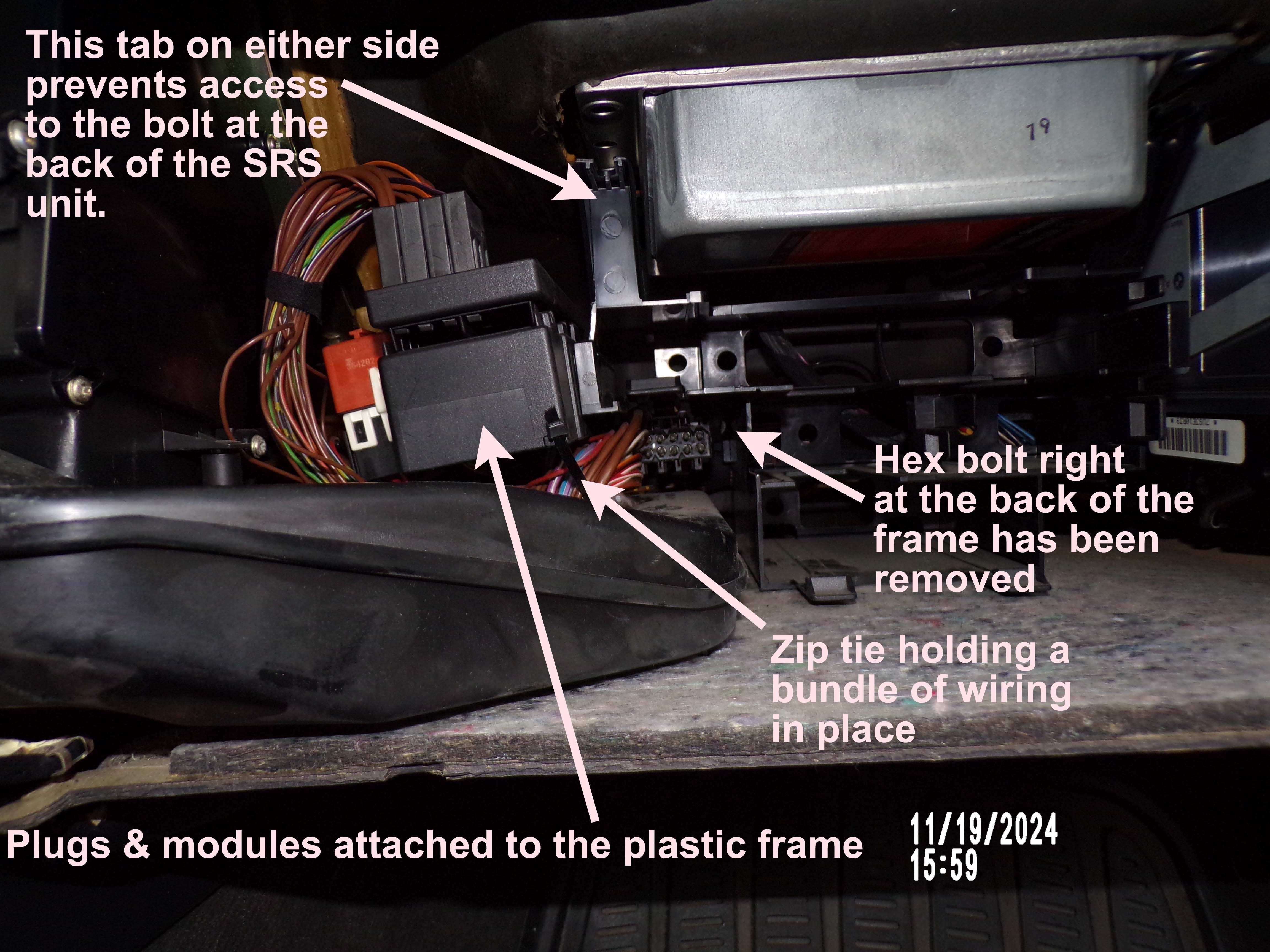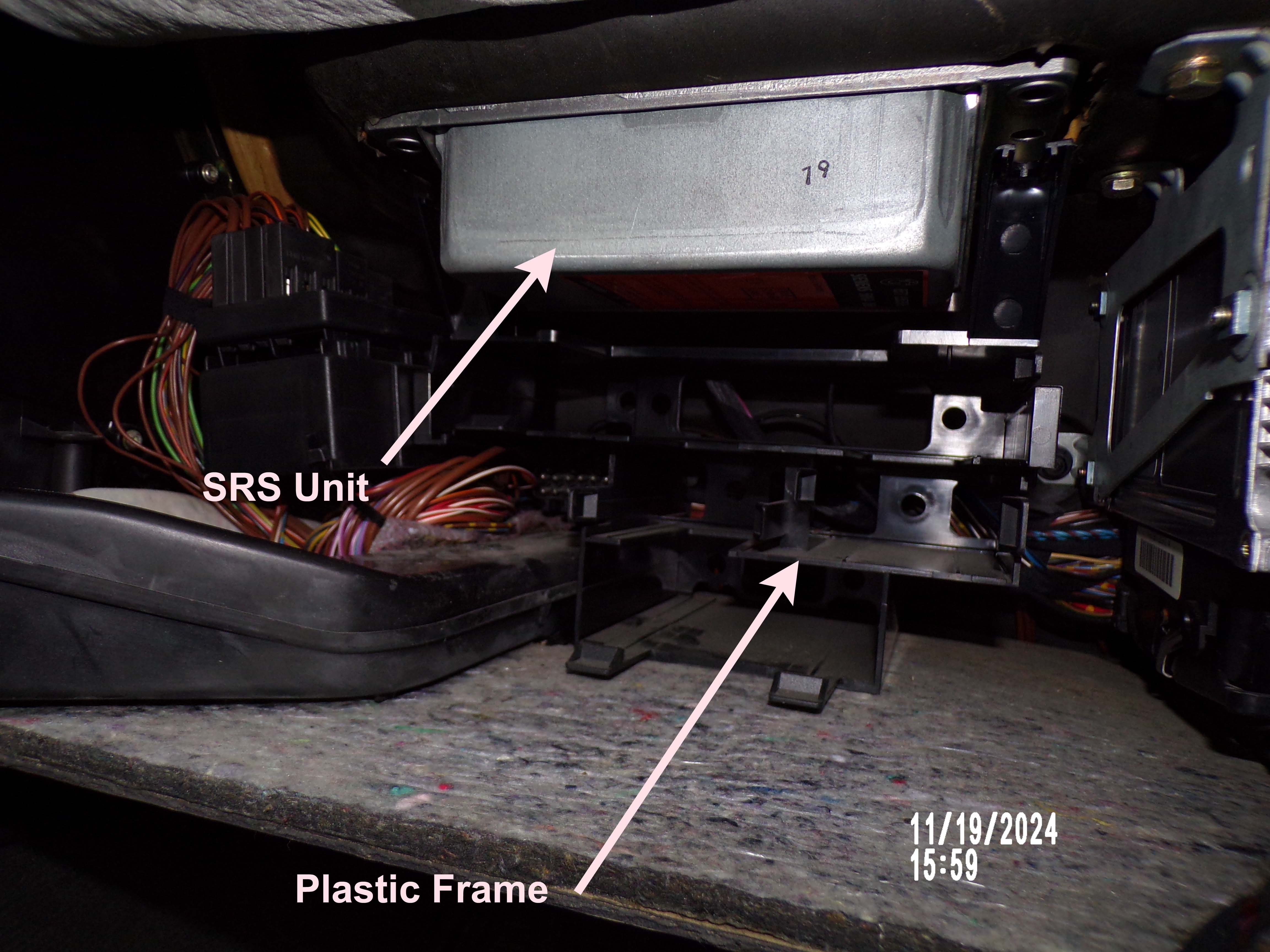 I have been having one helluva time trying to remove this SRS module (I have removed the glove box after some hassle). I have removed the bolts on each side closest to the glove box but the ones on either side at the furthest point from the glove box are a bit** to get to. I have tried to remove the plastic frame that holds various plugs on the left of the frame and undid and removed the hex bolt right at the back of the plastic frame. But I am still having trouble removing this as it needs to be removed to get to the hex bolts at the back on either side.