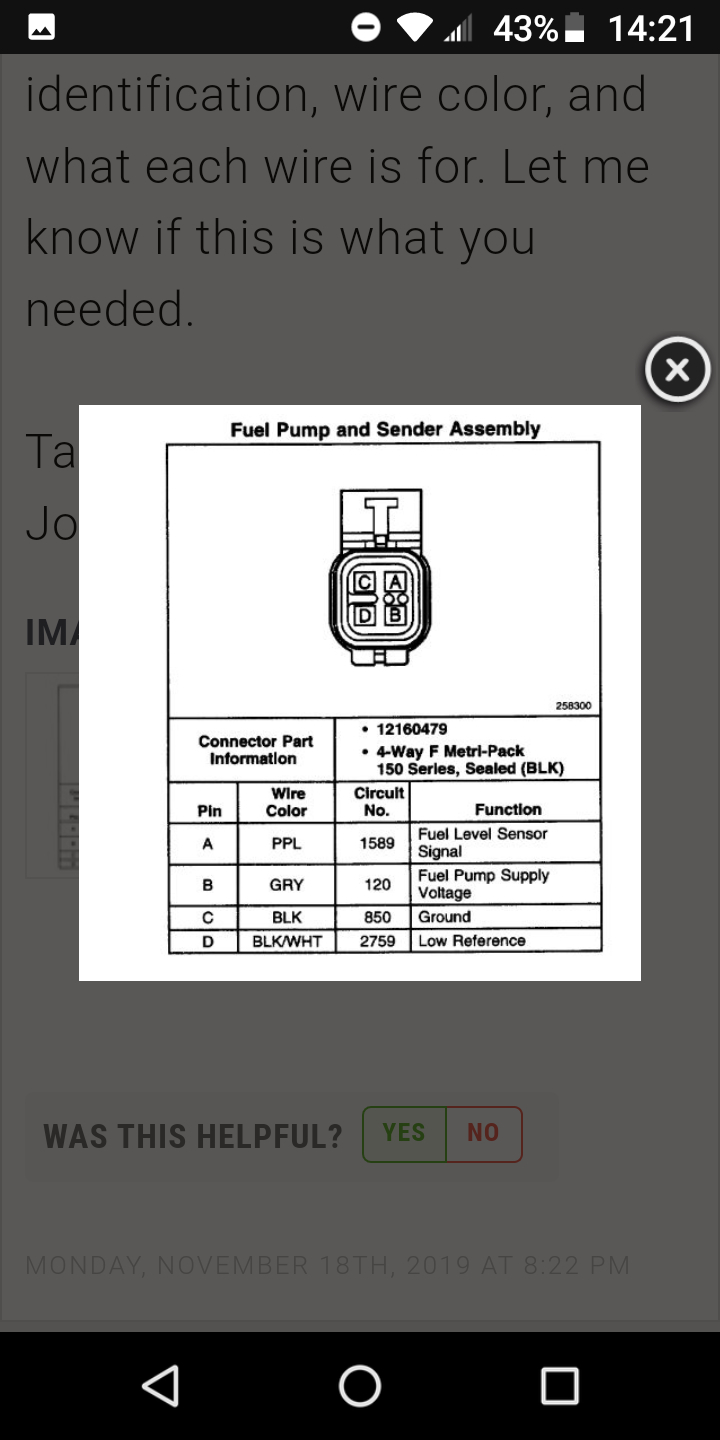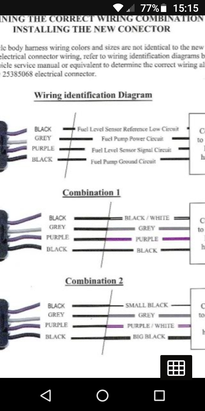 On the above car I am attempting to replace the fuel pump. The harness on the old pump is a square 4 pin. The new pump has an oval 4 pin. The wires are the same color from the car and also the new pump. There are 2 black wires. One of the black wires is a thicker gauge. Then there's a purple and a gray wire. Please see pics below. I'm thoroughly confused. Please help. New harness is on left. Old harness is on right.