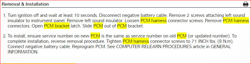 The PCM is located under the left side of instrument panel, near steering column. I attached some instructions and a relearn procedure needed after PCM replacement. Hope this helps!