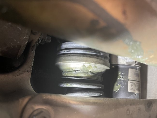 It almost looks like the boot was replaced or packed with grease and the excess grease got everywhere. Especially on the shaft. And as it spins the great got scattered on the other components.