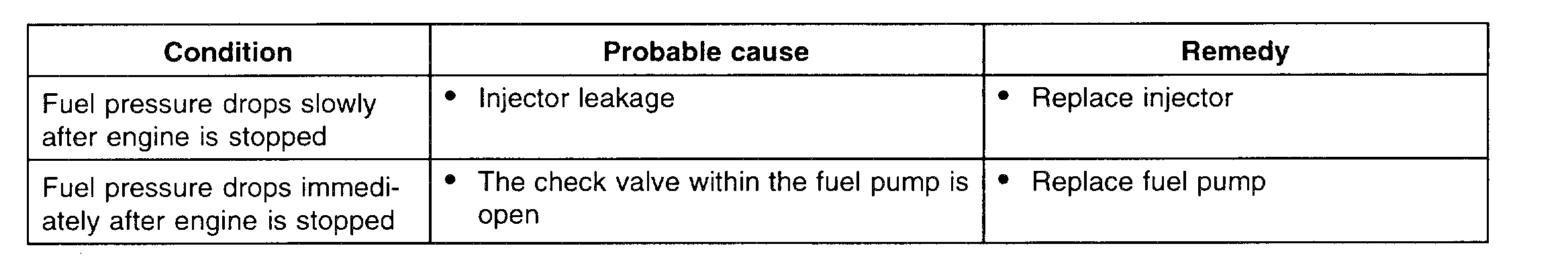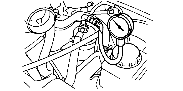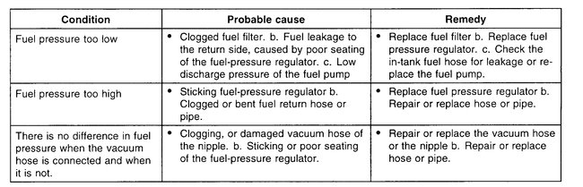 10. Stop the engine and check for a change in the fuel pressure gauge reading, which should hold for approximately 5 minutes. If the gauge indication drops, observe the rate of drop. Determine the remove the causes according to the following table.