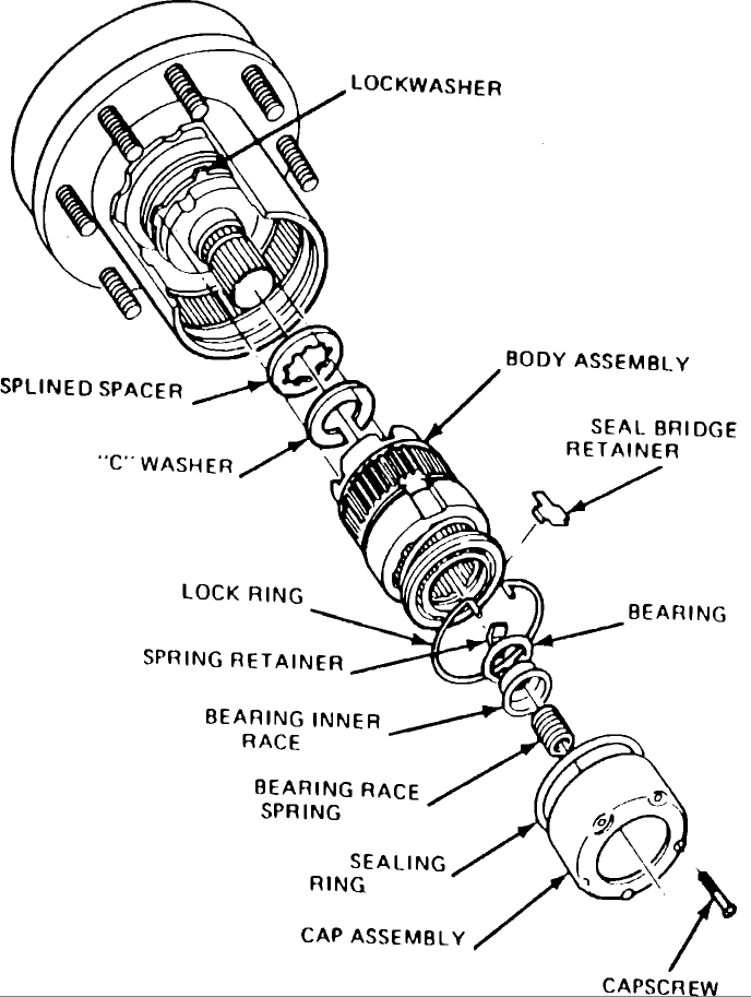 The auto-hub breakdown is shown, the manual hubs are much simpler, but it is very easy to break the small bolts off that retain the caps on both.