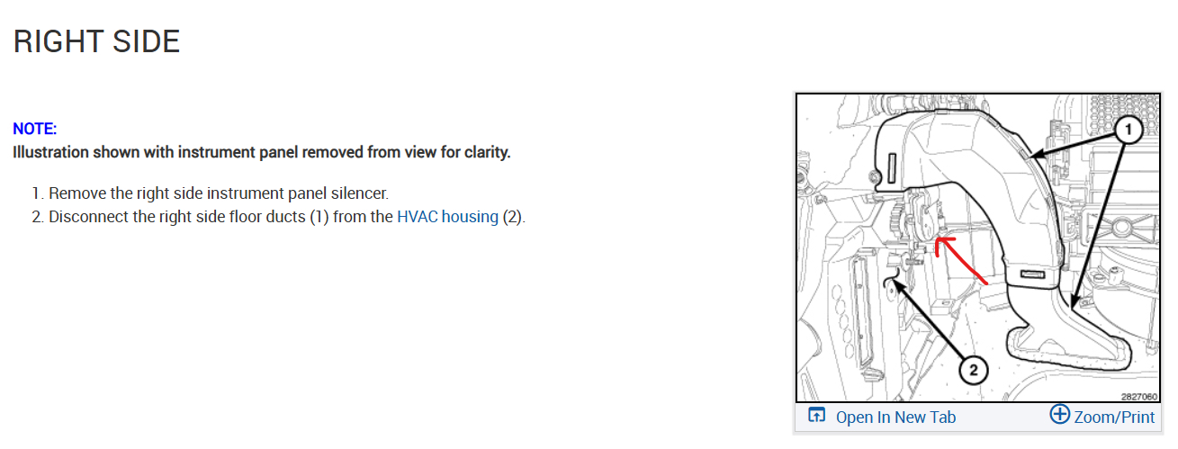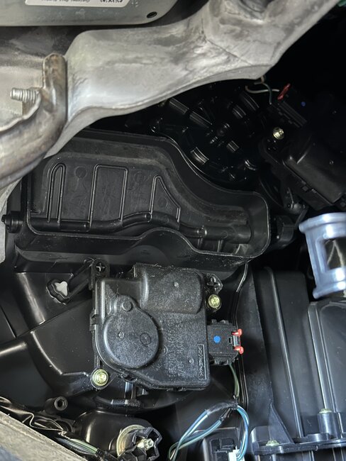 This unit has dual zone electronic temperature control. My original problem was the blower wasn't working, so I tried replacing the power module, but to get to it you have to remove the ductwork to the floor on the passenger side. As it turns out, the problem was fixed by replacing the blower relay. But as I tried to reinstall the floor vent duct work, which is high up in the dash and not visible, I had the blower on so I could tell if the piece I was tried to fit in was over the air source. I had a strong air flow thru the piece at times but could not get it to snap in place. In that process, I may have done something (closed the flap) to the air flow diverter. Because now, the air flow is nonexistent to the floor or the other vents and changing the air flow on the controller (defrost, vents or floor) doesn't change the air flow at all. I have since removed the glove box and its internals and have a clear view of the where the vent ductwork attaches and can see two actuators that control air flow. I decided to wait for some instruction before disassembling anything else.