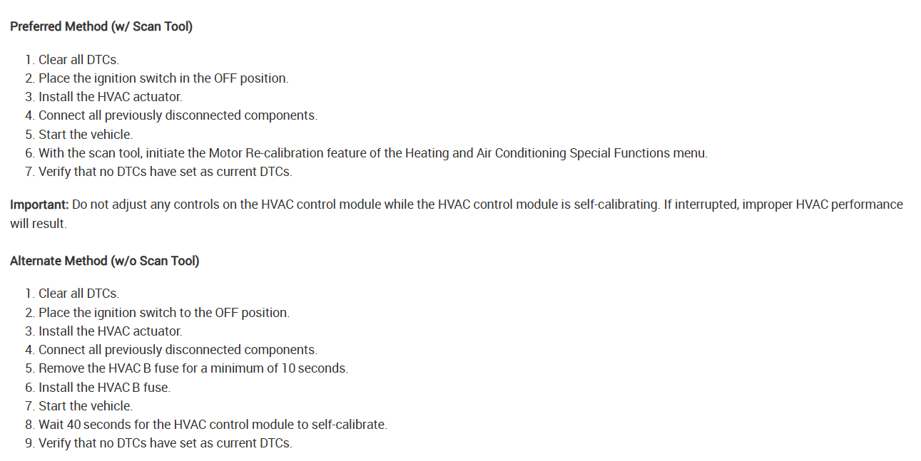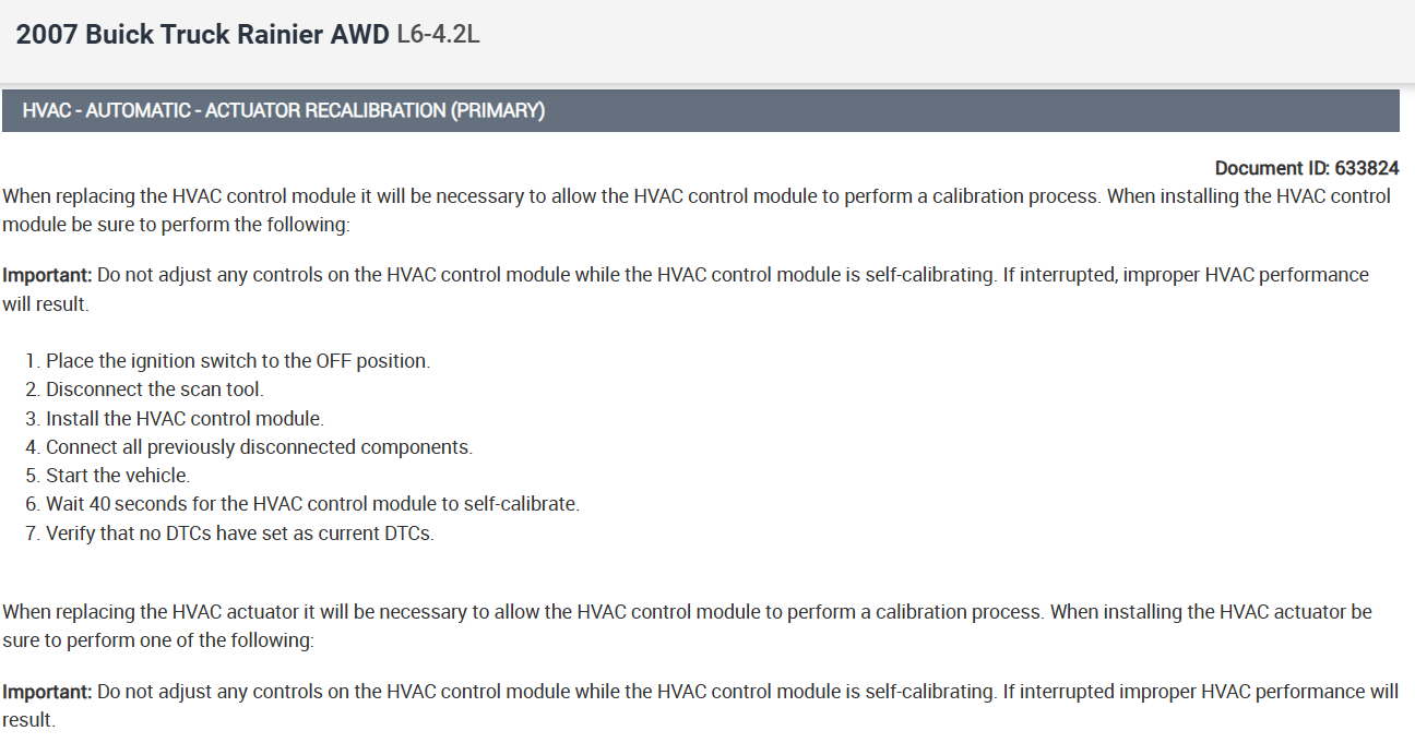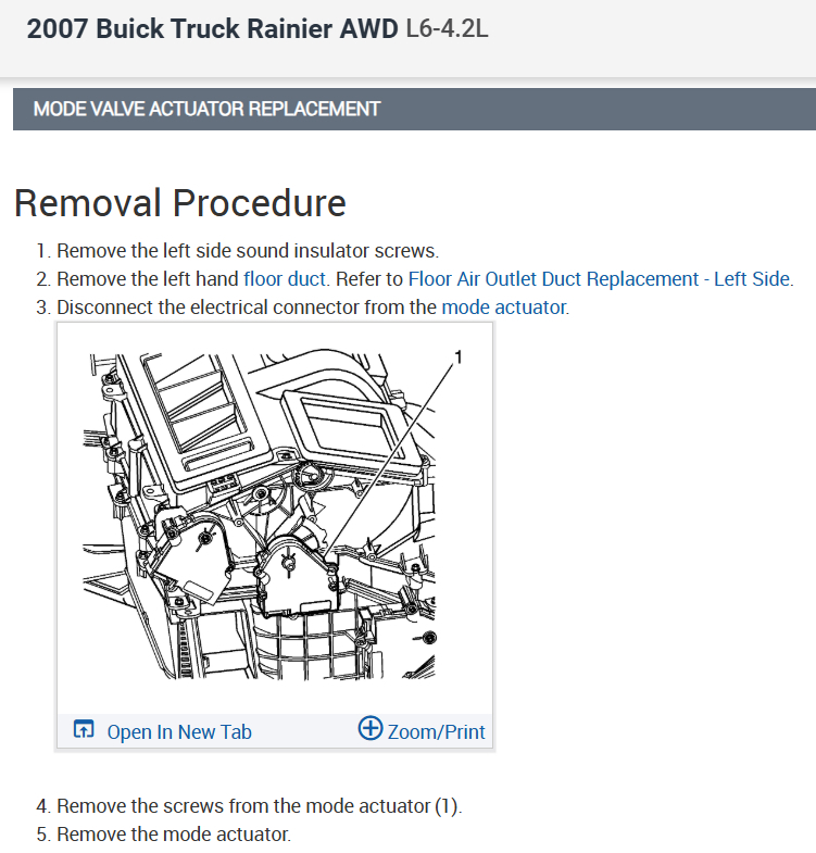 Hello, the mode actuator that controls the air coming out of the vents from the face to the floor went bad, and I purchased a used one from A-premium. It didn’t work and so I purchased a brand new one (same brand) and it didn’t work either. Well, I say it didn’t work, but when you turn the vehicle on, it Moves from one side to the other, and then stops, but when I use the controls on the center dash to move it from the face to the floor or to the defrost, It does not move at all. I have the automatic (HVAC) climate control in this Buick. So, I’m just trying to figure out what the issue is. Can you pull up the diagram and schematics of how to properly install it? Also, when working on this, I am going up under the dash on the driver side with my hand and long arms to work on this, because I would really like to not have to take the entire dash apart.