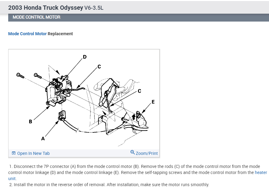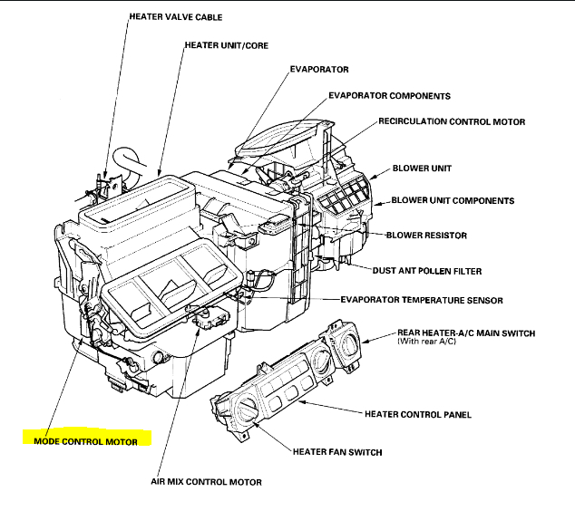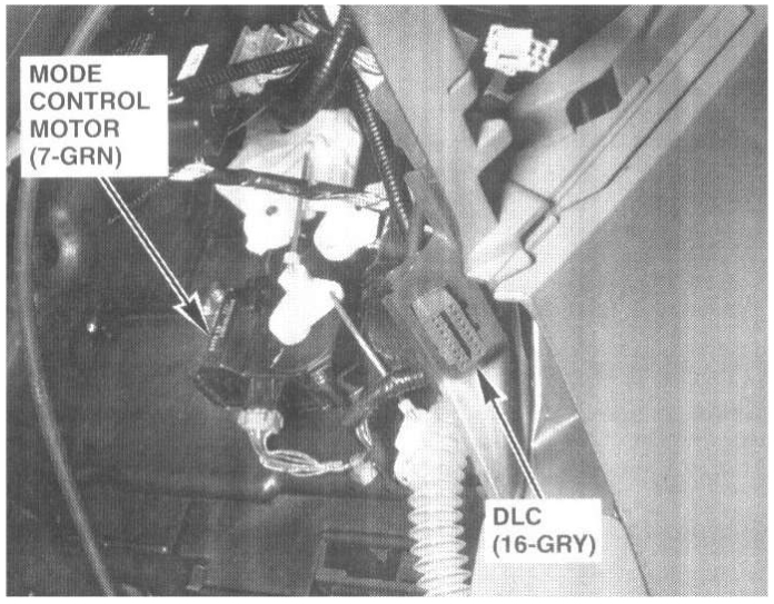 Cannot get any air through defroster vents. The mode can be changed by pressing "MODE" button and pictorial display changes, but air only comes through the dash vents. The air temperature changes correctly, just cannot adjust where it comes out.