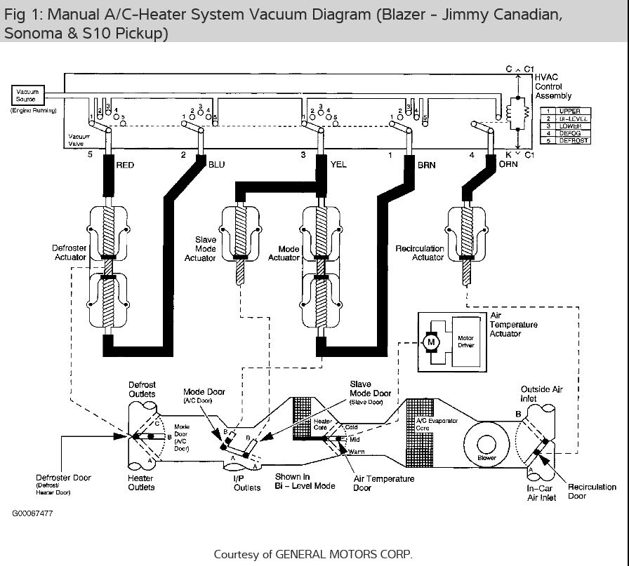 Need vacuum hose diagram for under the dash. Fixed all parts and hoses under the hood and I have vacuum going into the firewall, but no vacuum inside. I have a new selector switch and also fixed a loose hose behind glove box. Will be replacing radio so I will have the dash all apart. Would like to follow the vacuum lines to fix the problem. All of the air comes out the front air vents. One of the plungers that controls that is behind the glove-box door and that part is new and I am not getting no vacuum to that part at all. Thanks for any help someone can give me.
