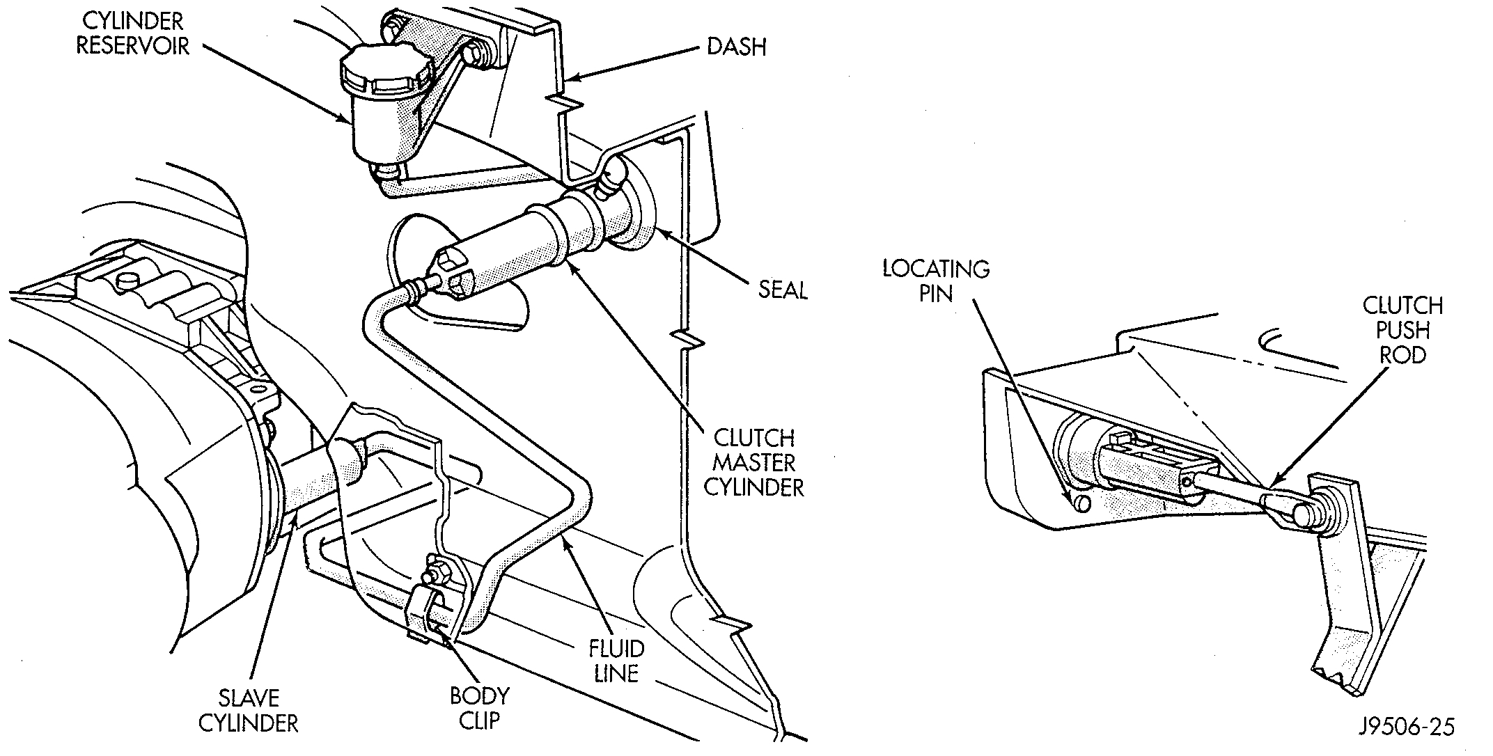 NOTE: The clutch master cylinder, remote reservoir, slave cylinder and connecting lines are all serviced as an assembly. These components cannot be serviced separately. The linkage cylinders and connecting lines are sealed units. They are pre-filled with fluid during manufacture and must not be disassembled nor disconnected.
