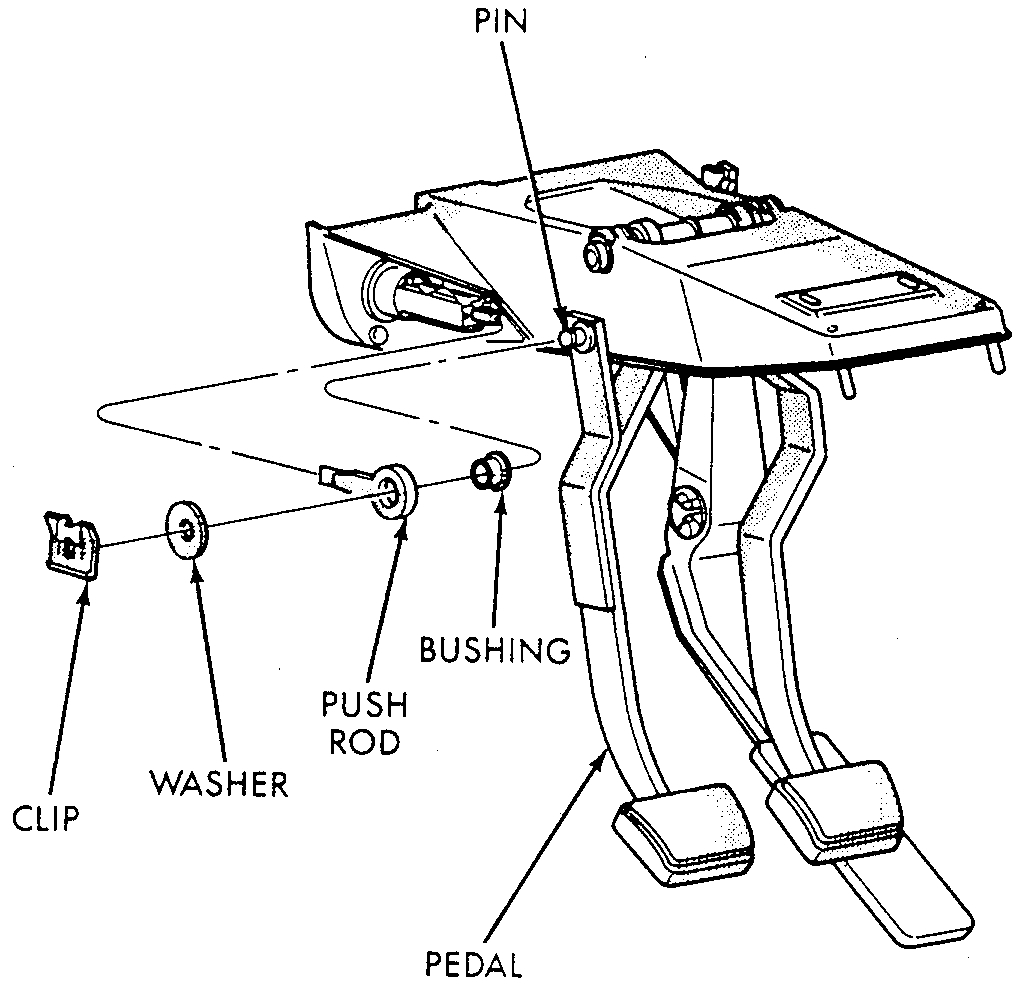 9. Remove retaining clip, flat washer and wave washer that attach clutch master cylinder push rod to clutch pedal.