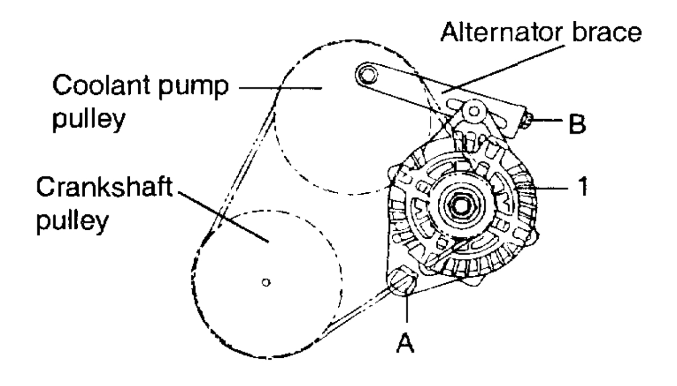 1. Loosen the alternator nut "A" and the tension adjuster lock bolt "B".