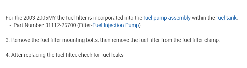 For the 2003-2005 model years the fuel filter is incorporated into the fuel pump assembly within the fuel tank. So the fuel pump will need to be removed to service the fuel filter. Check out the images (Below). Please let us know if you need anything else.