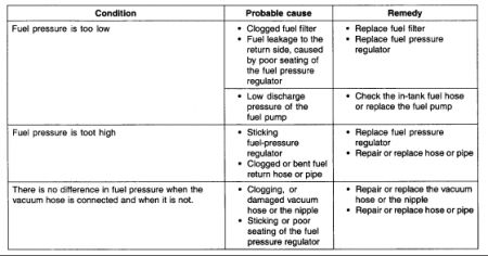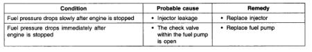 Stop the engine and check for a change in the fuel pressure gauge reading, which should hold for approximately 5 minutes . If the gauge indication drops, observe the rate of drop. Determine and remove the causes according to the following table.