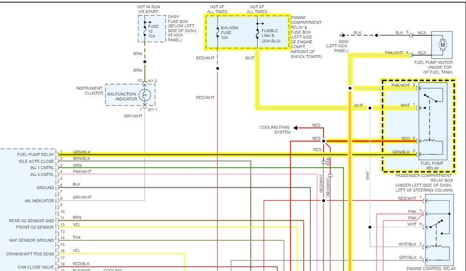 So I figured the problem could be fuel, spark or air. Checked the spark and air and they are good. Check the fuel and there was no gas going to the engine. So I took out the back seat and checked the fuel pump. The fuel pump turns on if manually given 12 volts but it doesnt turn on normally. Checked the voltage at the electric line coming in and it was 0. So I thought it was the fuel pump relay. I swapped out one of the relays from the front and still no voltage.