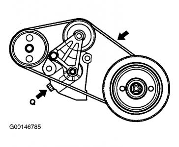 9)- Install the new steering power belt following the direction of the belt showed in the graphic of step #7, be sure the canals fit properly, and adjust the tension pulley bolt. Adjust the bracket bolt.