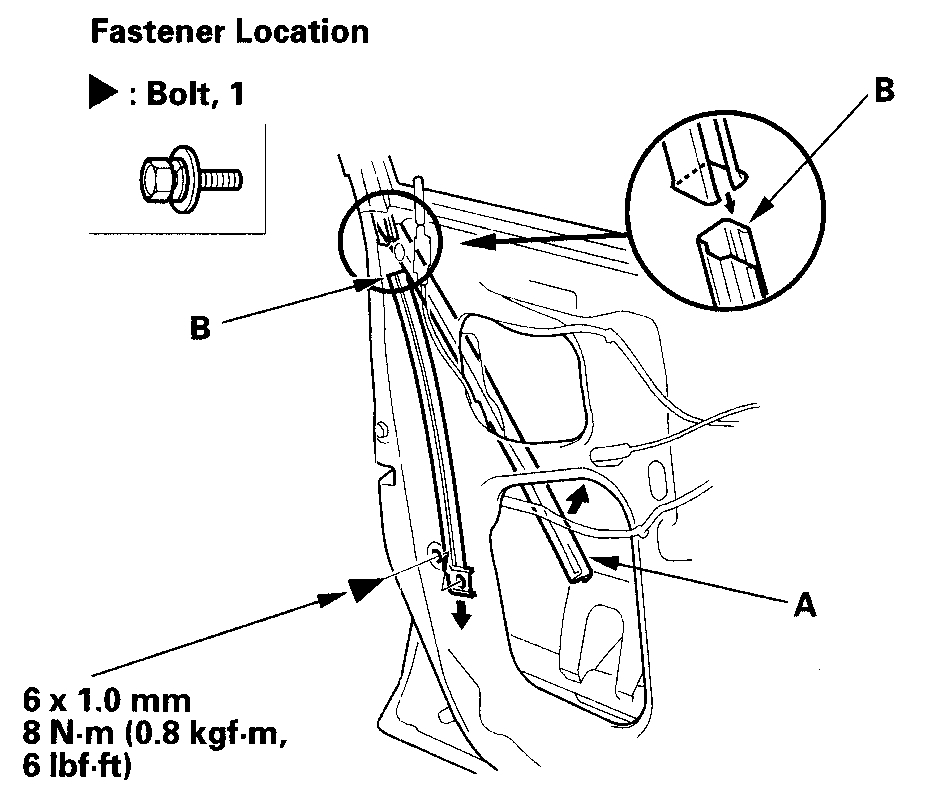 3. Pull the glass run channel (A) away as necessary, and remove the bolt, then remove the center lower channel (B) by pulling it downward.