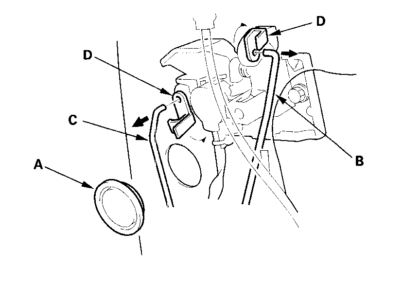 4. Remove the maintenance cap (A), then disconnect the outer handle rod (B), and cylinder rod (C) from the joint bushings (D).