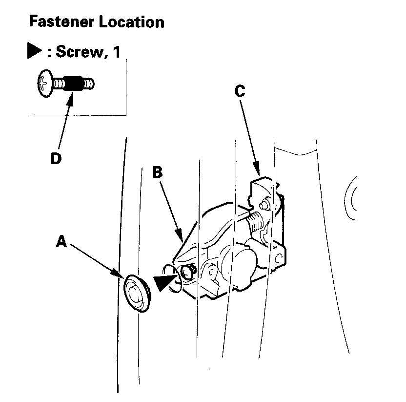 5. Driver's and some passenger's: Remove the maintenance cap (A) from the rear of the door, then loosen the screw securing the lock cylinder protector (B) and the outer handle (C).