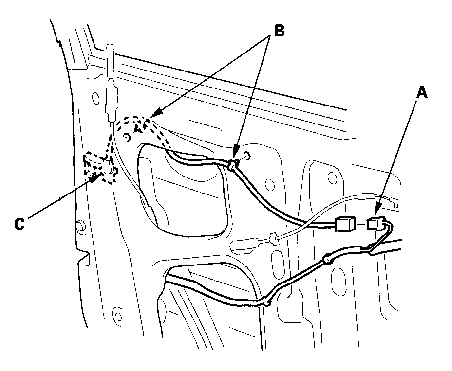 7. With lock cylinder switch: Disconnect the lock cylinder switch connector (A), and detach the harness clips (B), then remove the lock cylinder switch (C).
