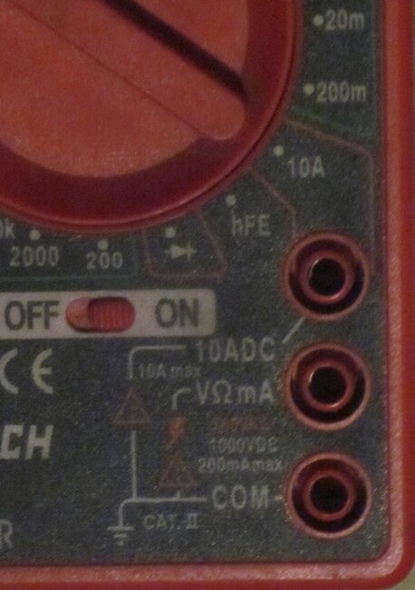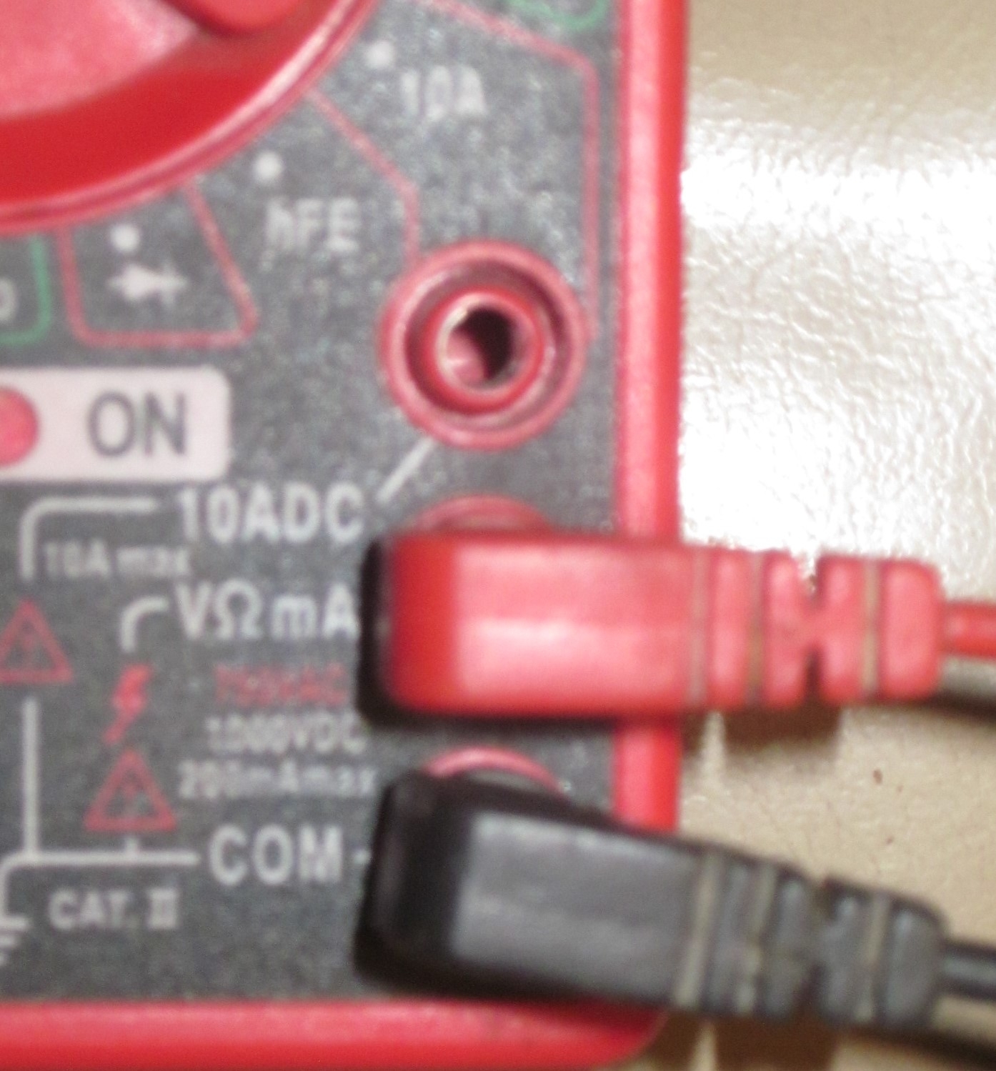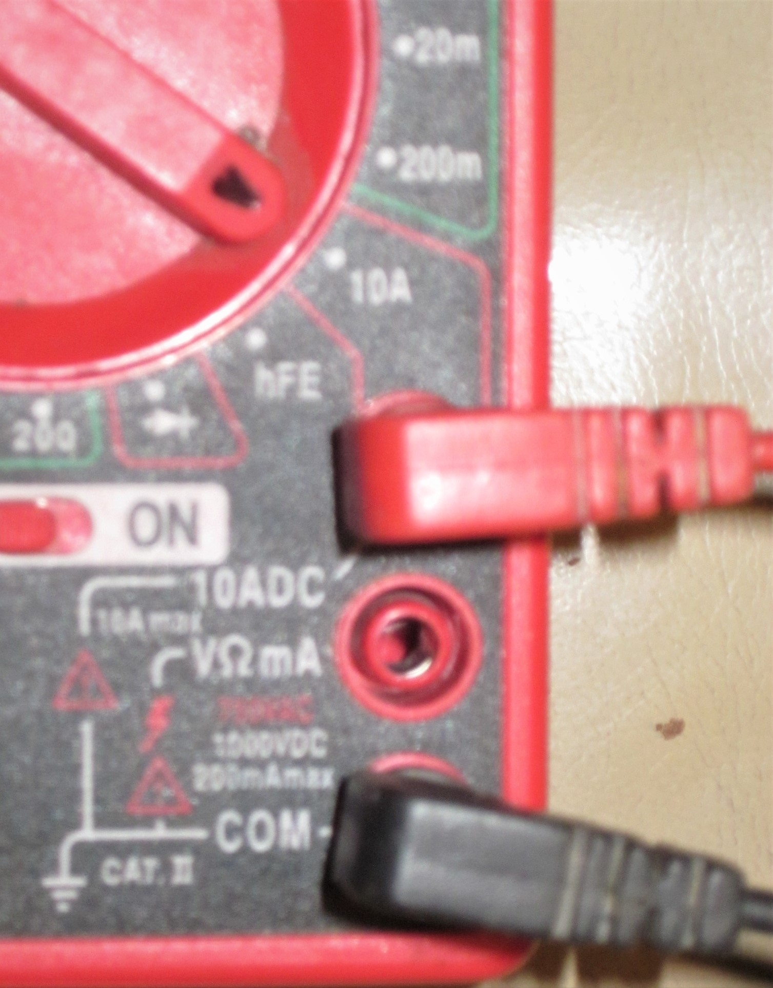 Meters in this price range commonly have three jacks for the probes. Photo 2 shows them in more detail. The black, negative probe goes in the bottom jack. That one is used for all of the functions and ranges. The top jack is used for the red, positive probe for only the highest current range. This meter can measure up to 10 amps DC. ("DC" stands for "direct current" which is used in cars and trucks, and can be stored in a battery). This meter can not measure AC current which is found in house wiring. The middle jack is used for every other function and range except the 10-amp range. The probes are plugged in to the two jacks used most often in the third photo.