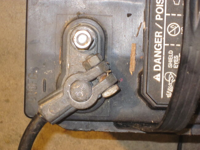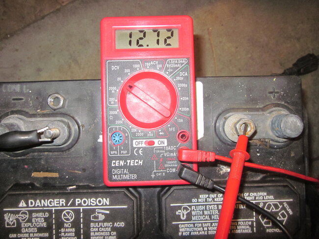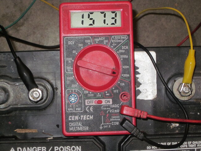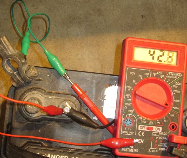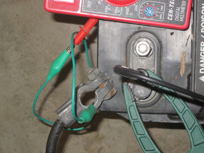 Finally, in the fourth photo, we're measuring this battery's voltage. It takes four hands to hold two probes and run a camera. I only have two, so here I'm using a pair of clamps to hold the probes on the battery's posts. In the fifth photo, it's the same battery and meter, but it's a different negative probe. The probe was broken, and replaced with an "alligator clip". Now only three hands are needed.