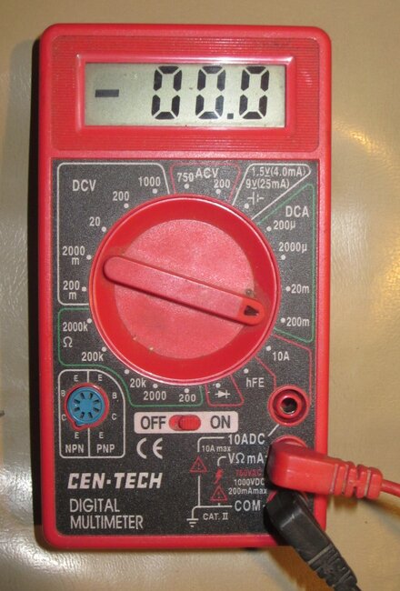 There's two common mistakes that will not damage the meter. The first is switching the probes on the battery's positive and negative posts. The display will include a minus sign indicating a negative voltage. Switch the probes to solve that, however, we're usually just interested in the value, not the polarity, so the minus sign can be ignored. The second mistake is using the wrong scale. In the sixth photo, the meter is set to the "2000 millivolts" range, meaning the 2 volt range. It can only measure up to 1.999 volts, but with an extra decimal place of accuracy. The battery has a much higher voltage than can be measured on this scale, so it's showing a "1". Every digital meter has some means of indicating an "over range" condition. This one uses a "1". Simply rotate the range switch to the next higher range.