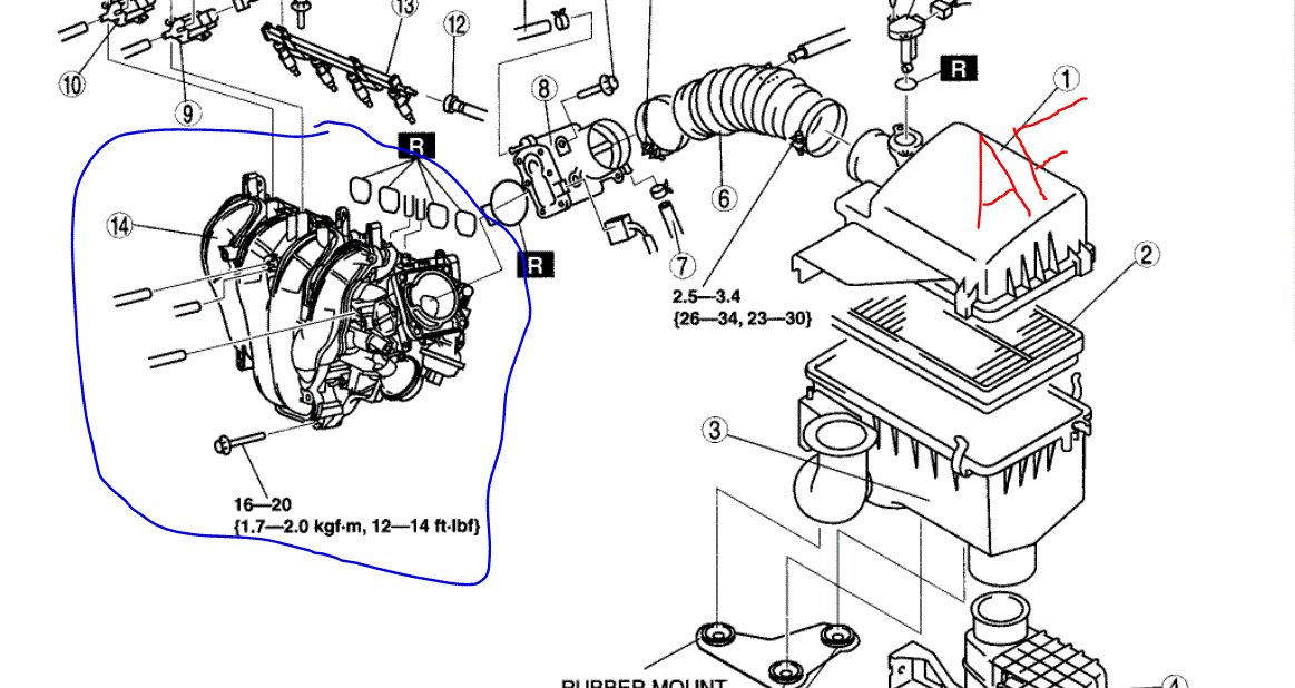Also, I circled in blue the intake manifold on pic 2. If you follow the air induction tube from the air filter box (AF in pic) it will lead you to the throttle body which is attached to the intake.