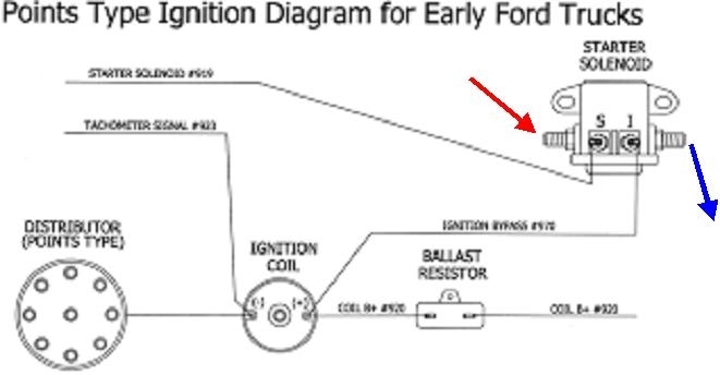 I searched for a couple of hours, but I can't find a wiring diagram that reproduces well enough to be of use. The best I could come up with is this one. The red arrow is pointing to the terminal that connects to the positive battery cable. There's often a second wire attached that feeds all the other circuits including the ignition switch, so that has to be connected for the starting system to work. The blue arrow shows where the cable goes down to the starter. There will never be a second wire hooked there.