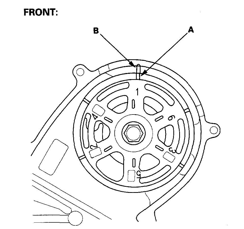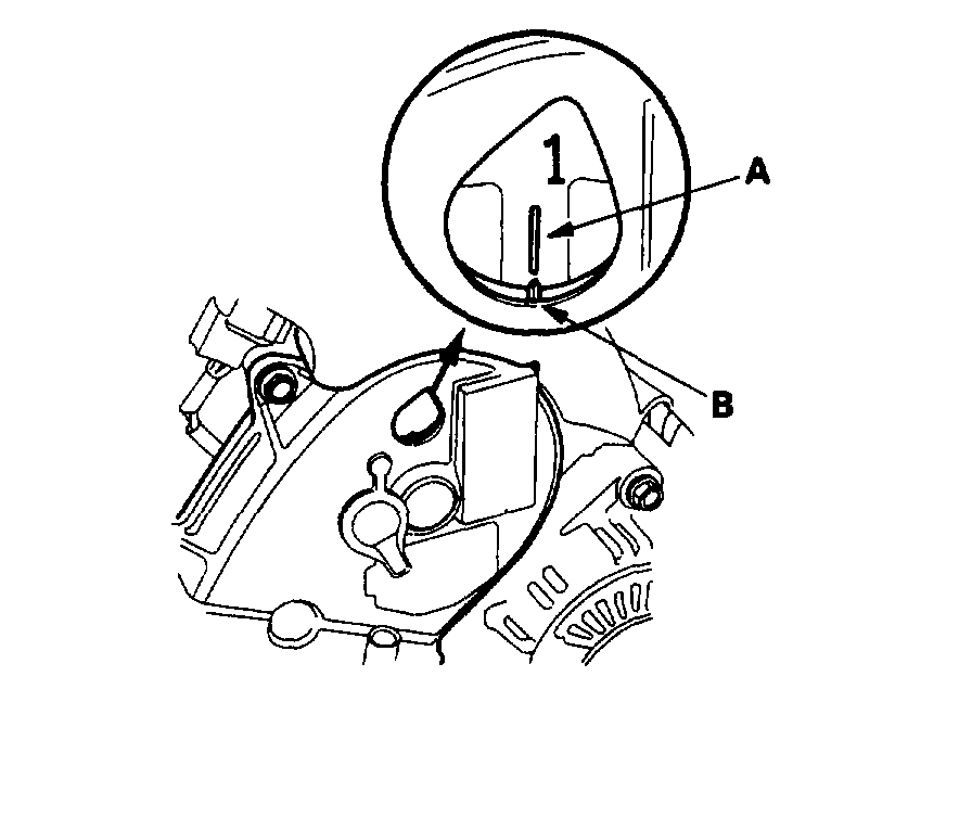 1. Turn the crankshaft so its white mark (A), lines up with the pointer (B).