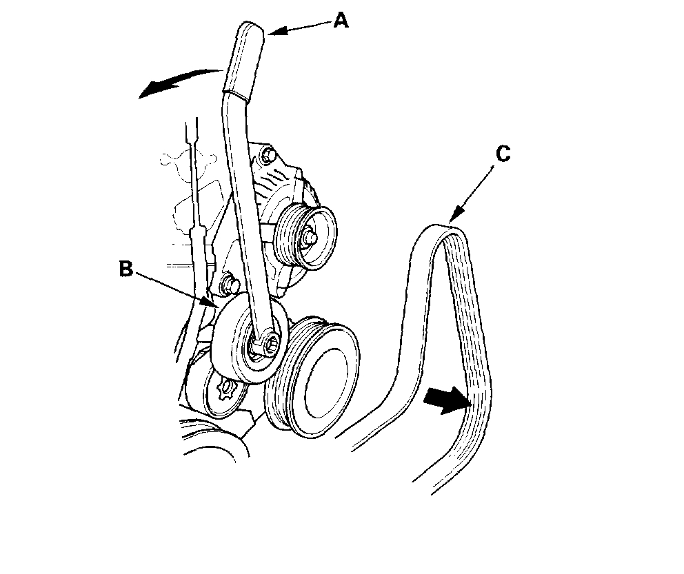 5. Use the belt tension release arm (A) to move the auto-tensioner (B), then remove the alternator belt (C).