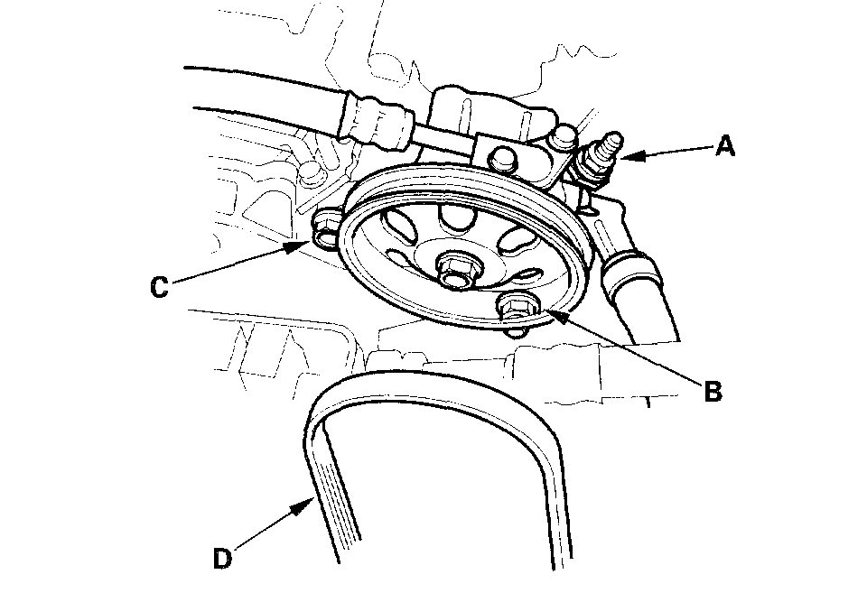 6. Loosen the adjusting nut (A), locknut (B), and mounting bolt (C), then remove the Power Steering (P/S) pump belt (D).