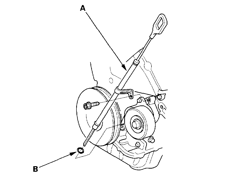 9. Remove the dipstick and tube (A); discard the O-ring (B).