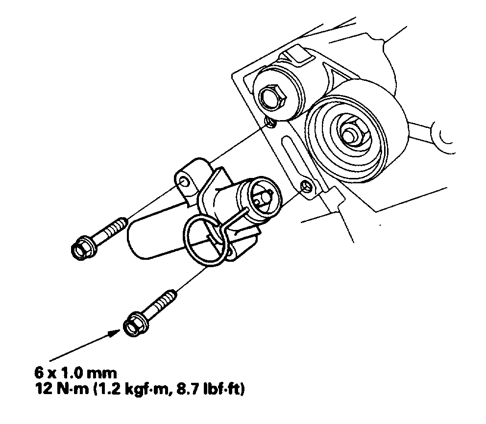 14. Screw the battery clamp bolt in to hold the timing belt adjuster in its current position. Tighten it by hand, do not use a wrench.