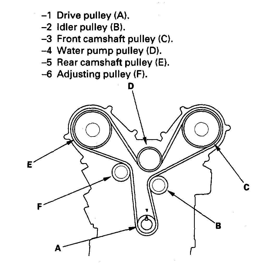 5. Install the timing belt in a counterclockwise sequence starting with the drive pulley. Take care not to damage the timing belt when installing it.