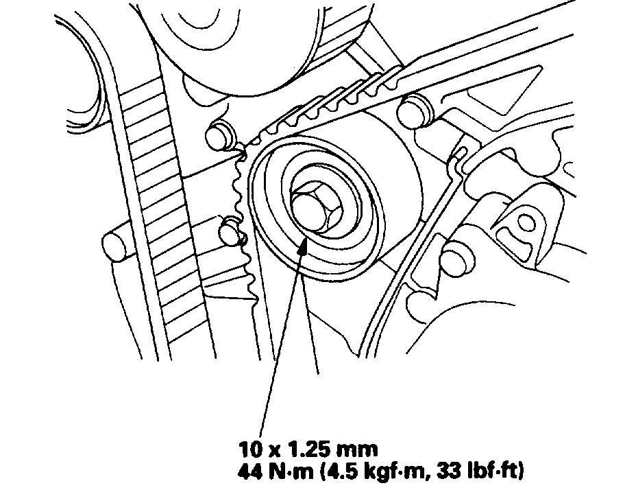 15. Install the crankshaft pulley, and tighten the bolt to 245 Nm (25.0 kgf/cm, 181 ft. Lbs.). Do not use an impact wrench.